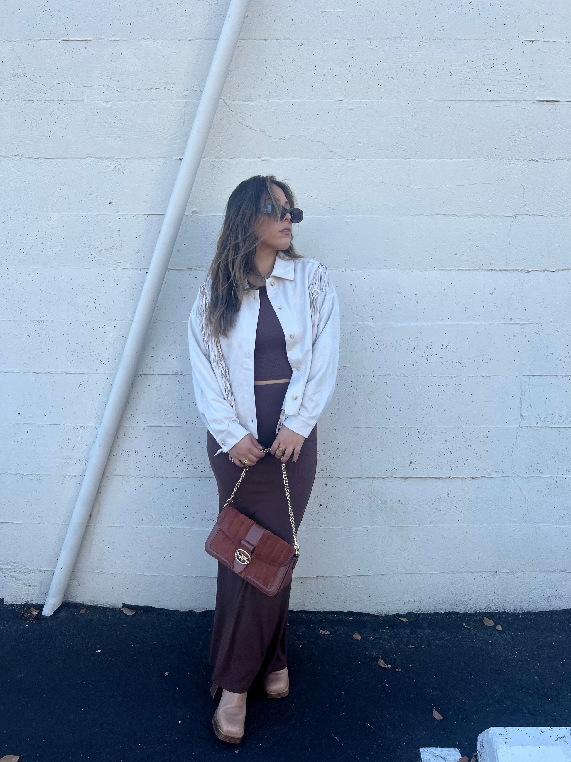 A timeless blend of classic charm and modern style. This fall essential features a soft suede feel and fringe detailing, making it the perfect statement piece for any occasion.